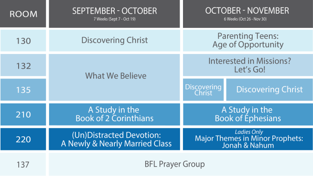We invite you to look over these classes and prayerfully consider which class will most help you as you continue growing in Christ.